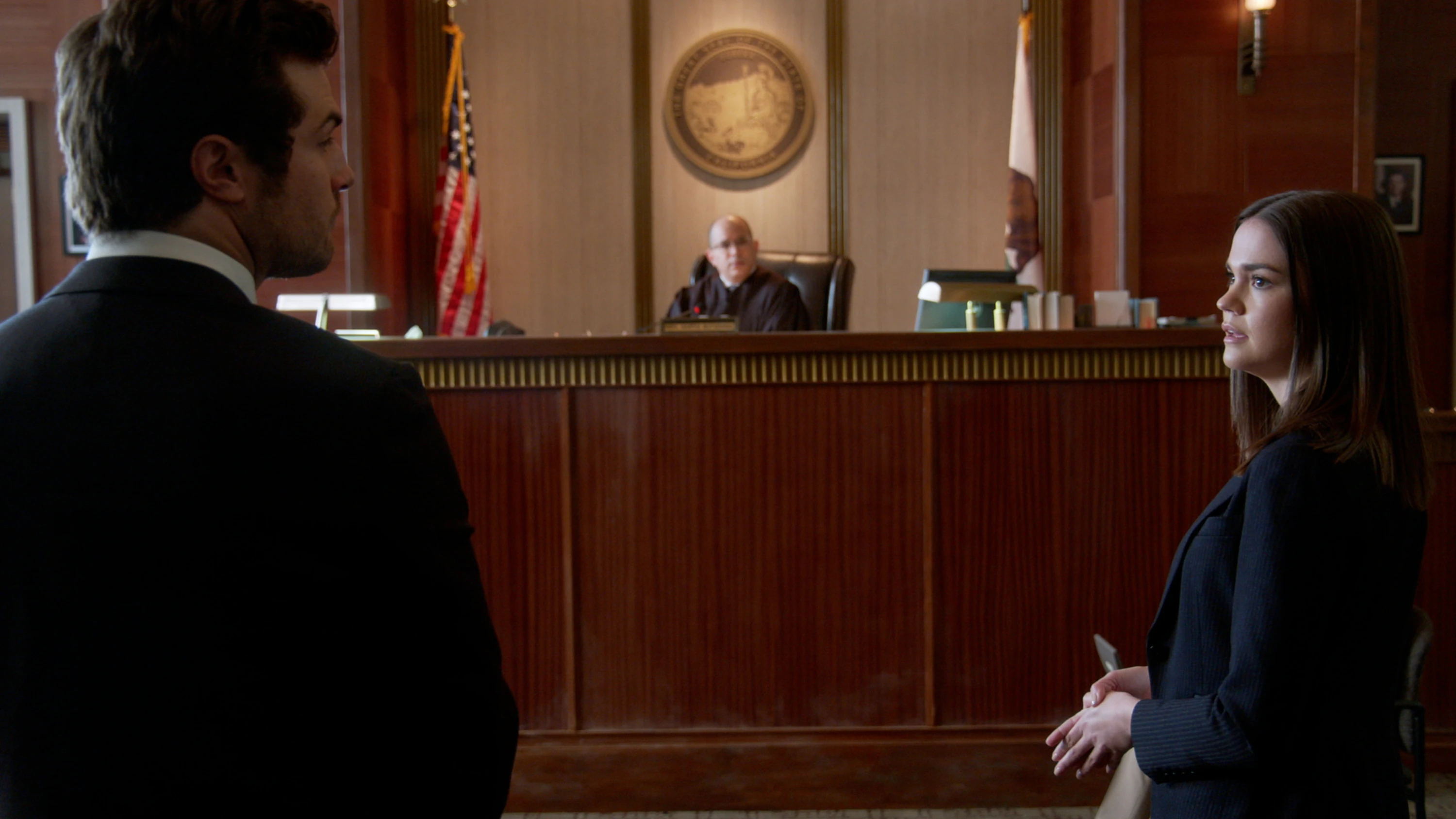 In court, Kathleen talks to Katie about the night of the party. Flashing sideways, Kathleen and Callie talk to Izzie about what happened between Katie and Tommy. Now, Kathleen asks Katie if she hated Zack and asks if the Instagram account is hers. She asks what the hashtag 2LDRZAS stands for. Flashing sideways, Callie asks Izzie the same question and learns that it stands for “too long didn’t read, Zack actually sucks”. In court, Katie calls it a joke so Kathleen asks if a picture of Tommy, Zack, and Katie with Zack’s face crossed out with the hashtag “Wish He Was Dead” is a a joke. Kathleen asks if Katie sent that to Izzie shortly before she sent Tommy on a beer run and Zack wandered over to the drop-off. Rothman objects as he needs to authenticate the image. Kathleen retorts that Katie already confirmed it came from her Instagram account. The judge allows it for that reason. Katie says she was joking because she was upset. Kathleen presses Katie and means and opportunity that night. The judge sustains but Katie blurts out that Tommy and Zack were hooking up but Zack broke up with him at the party and that’s what they were fighting about. Zack’s father has an outburst of anger that what Katie said is a lie as his son was killed by Tommy Sung because Zack replaced him on the football team. He shouts that his son wasn’t gay. The judge calls for order as Callie looks at Tommy.