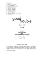 DTLA[2] is the first episode of Season 1 of Good Trouble. It aired on January 8, 2019. The first episode was available to stream from January 1, 2019, one week before the official premiere date.