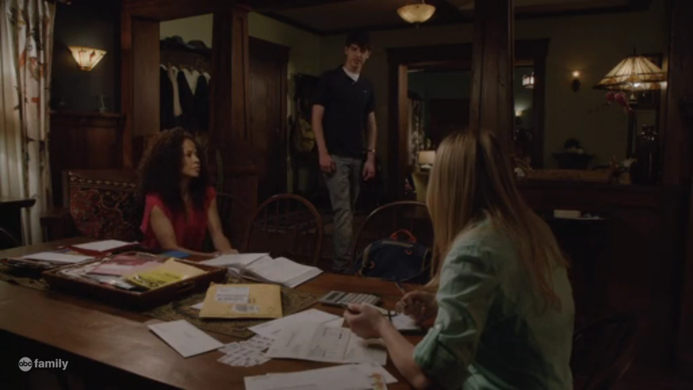 Jim asks about the housing bill, which sparks a debate between Stef, Lena, and Jim who have opposing viewpoints. The subject changes to why Callie went into criminal law. Jude thinks it’s because of the homeless man who went into her apartment, which is news to the moms. Callie nervously tells Stef that it wasn’t her apartment but Jamie’s, which surprises everyone. Callie explains Jerod’s break-in wasn’t criminal, as he was suffering from a mental episode. She explains Jerod’s situation to everyone, including Kathleen’s involvement, much of which is new to Jamie. Diane admires the Adams Fosters family’s need to serve and brings up hearing the homeless people’s lack of shoes, a statement that makes Stef roll her eyes toward Lena who gives her a pointed look.